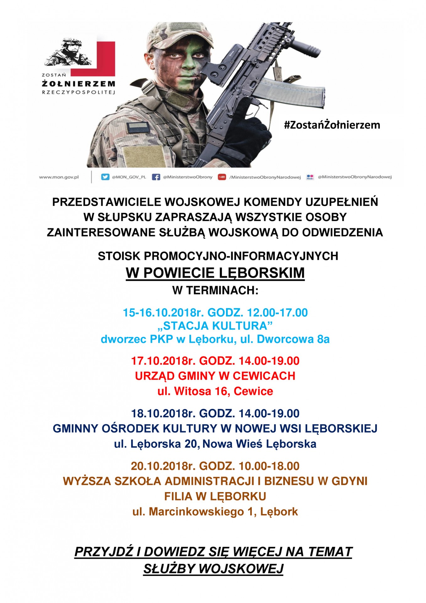 | PRZEDSTAWICIELE WOJSKOWEJ KOMENDY UZUPEŁNIEŃ STOISK PROMOCYJNO-INFORMACYJNYCH 15-16.10.2018r. GODZ. 12.00-17.00 „STACJA KULTURA” dworzec PKP w Lęborku, ul. Dworcowa 8a 17.10.2018r. GODZ. 14.00-19.00 URZĄD GMINY W CEWICACH ul. Witosa 16, Cewice 18.10.2018r. GODZ. 14.00-19.00 GMINNY OŚRODEK KULTURY W NOWEJ WSI LĘBORSKIEJ ul. Lęborska 20, Nowa Wieś Lęborska 20.10.2018r. GODZ. 10.00-18.00 WYŻSZA SZKOŁA ADMINISTRACJI I BIZNESU W GDYNI |