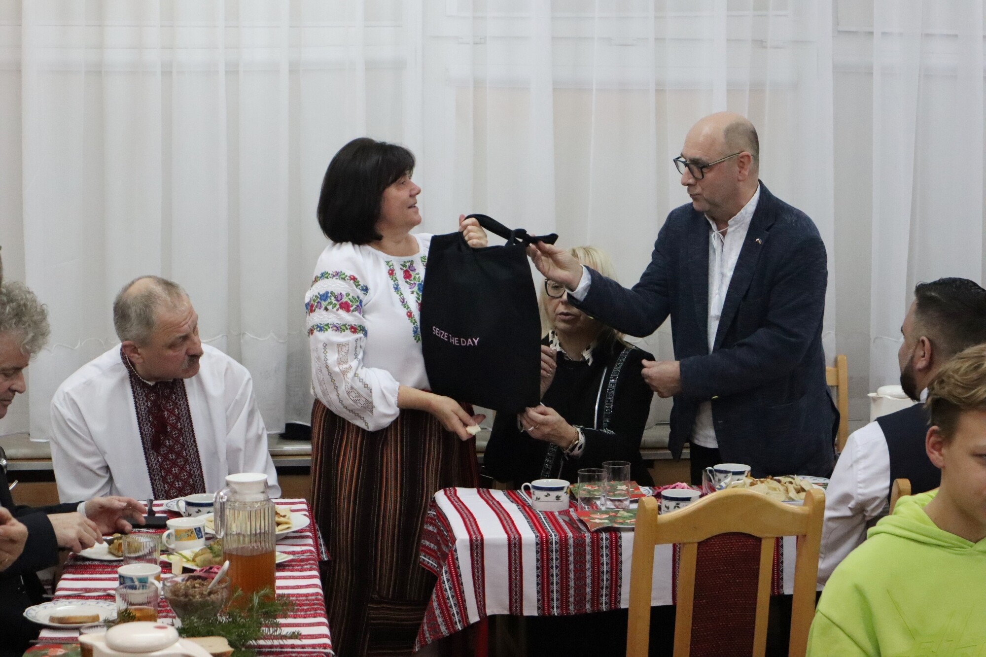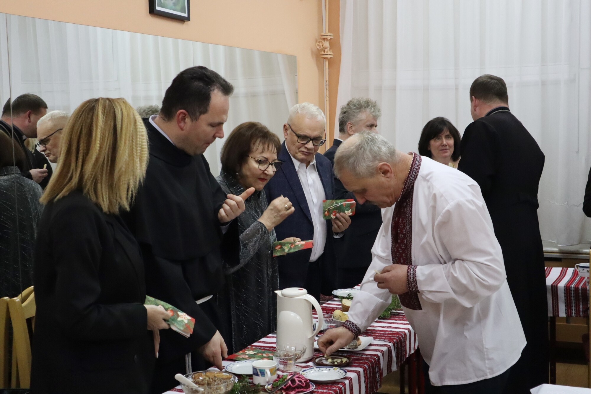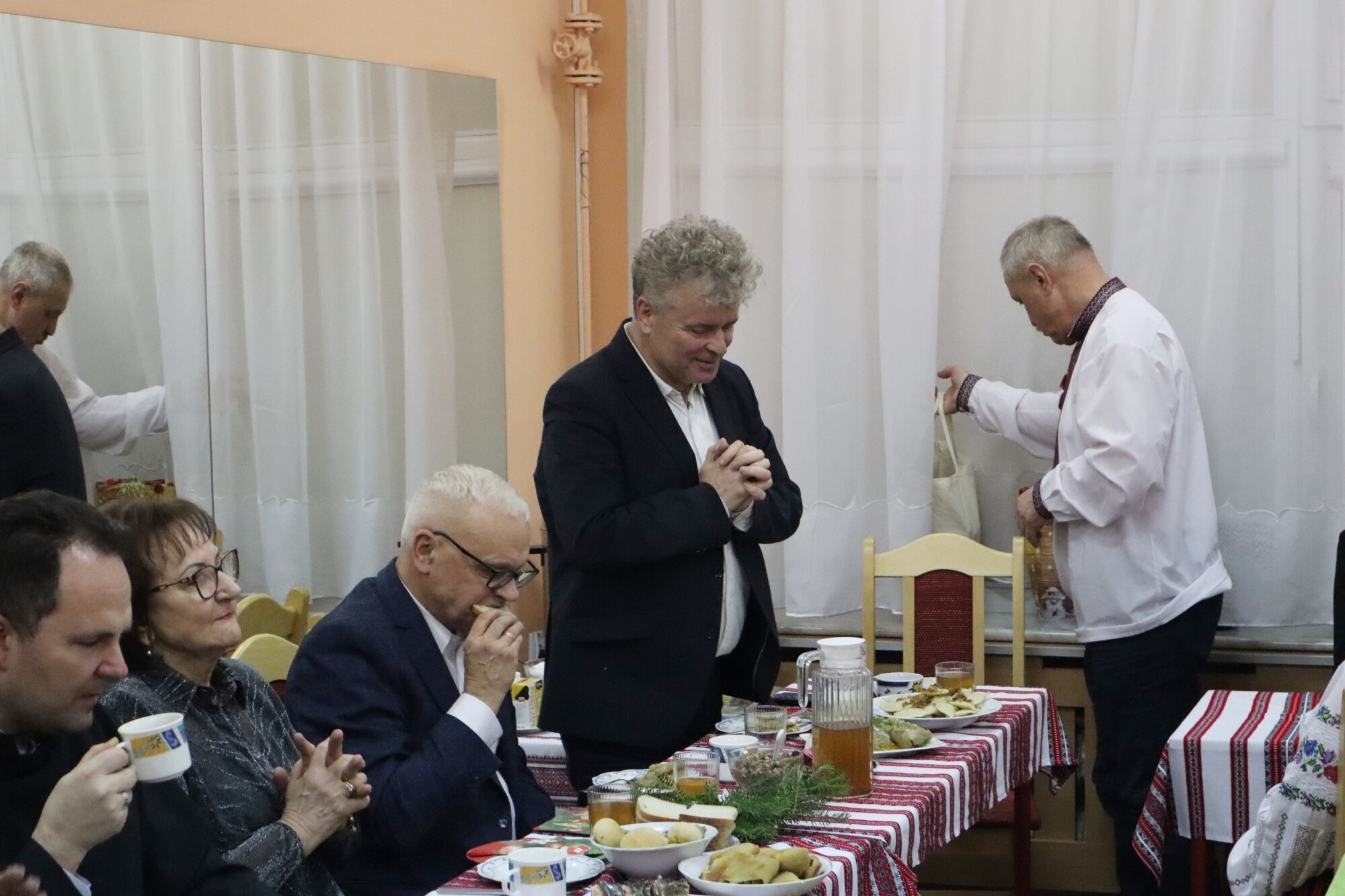 Przy wspólnym stole zasiedli rodzinnie członkowie Związku Ukraińców w Polsce, rodziny, które przyjechały do Lęborka z Ukrainy po inwazji rosyjskiej na Ukrainę w lutym 2022 r. oraz lokalni samorządowcy i osoby wspierające działania na rzecz wolnej Ukrainy i pomocy uchodźcom wojennym. W spotkaniu uczestniczyli m.in.: starosta Alicja Zajączkowska, burmistrz Lęborka Witold Namyślak, dyr. Lęborskiej SP nr 8 Daniel Nadworski, któremu podlega punk nauczania języka ukraińskiego i Patryk Bianga – prezes Zarządu Pomorskiego Oddziału Okręgowego Polskiego Czerwonego Krzyża. O duchowy wymiar uroczystości zadbali Olech Hrytsiv – proboszcz Parafii pw. św. Dymitra w Lęborku i o. Robert Wołyniec – kustosz Sanktuarium i proboszcz Parafii pw. św. Jakuba Ap. w Lęborku. Tradycyjnym potrawom postnym z obowiązkową kurią i czosnkiem towarzyszyła prosfora, czyli pieczywo z mąki, wody, soli i zakwasy, stosowane w kościele prawosławnym w obrzędzie przeistoczenia – w tym przypadku odpowiednik katolickiego opłatka wigilijnego. – W tym roku po raz pierwszy okres bożonarodzeniowy obchodzimy w tym samym czasie, co wyznawcy chrześcijańskiego obrządku rzymskiego – mówi Renata Romanko z lęborskiego oddziału Związku Ukraińców w Polsce.