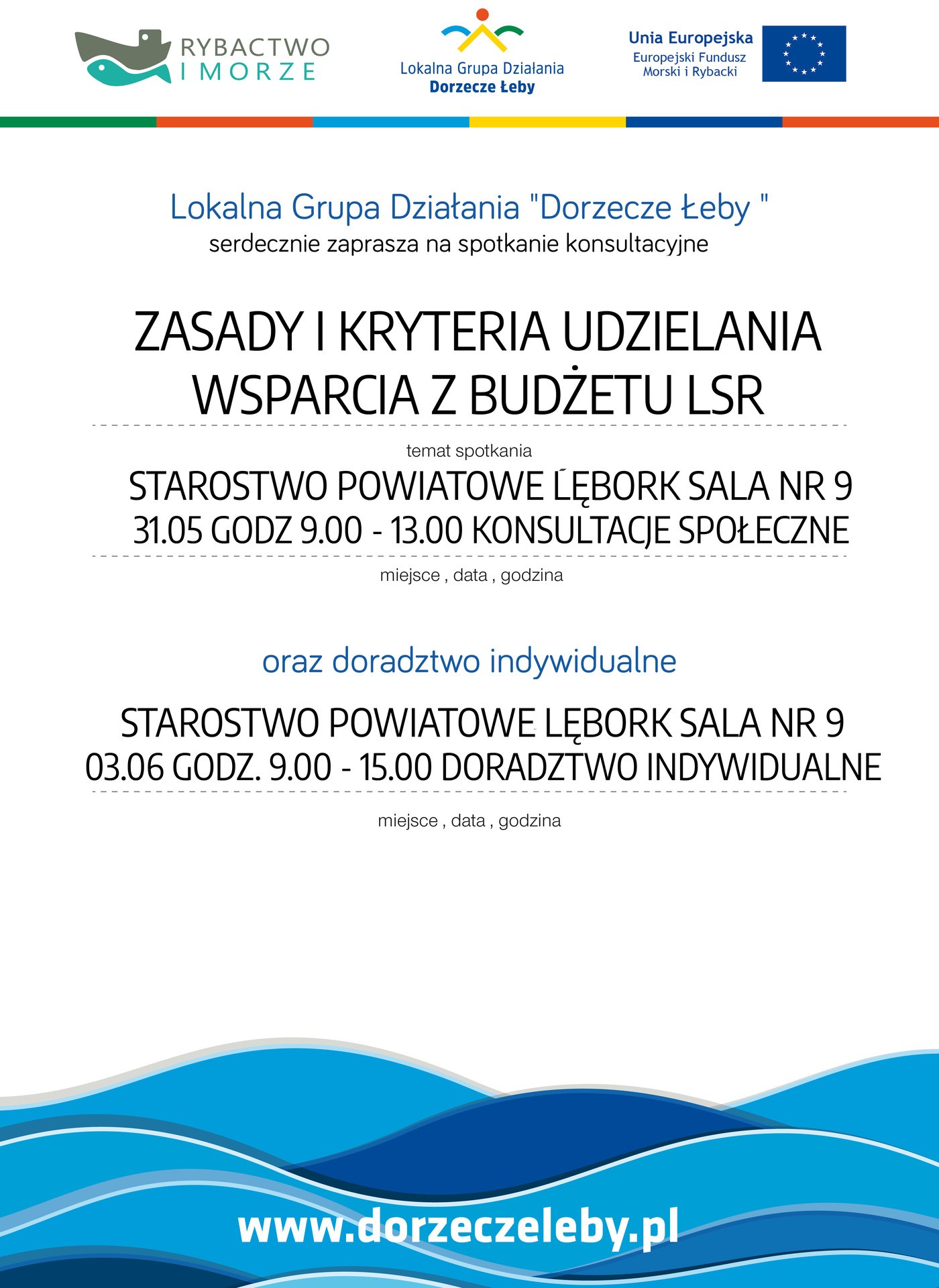 Lokalna Grupa Działania "Dorzecze Łeby" serdecznie zaprasza na spotkanie konsultacyjne pn. "Zasady i kryteria udzielania wsparcia z budżetu LSR, które odbędą się w dniu 31.05.2019 r. w godz. 9.00- 13.00 w Starostwie Powiatowym w Lęborku, sala nr 9.