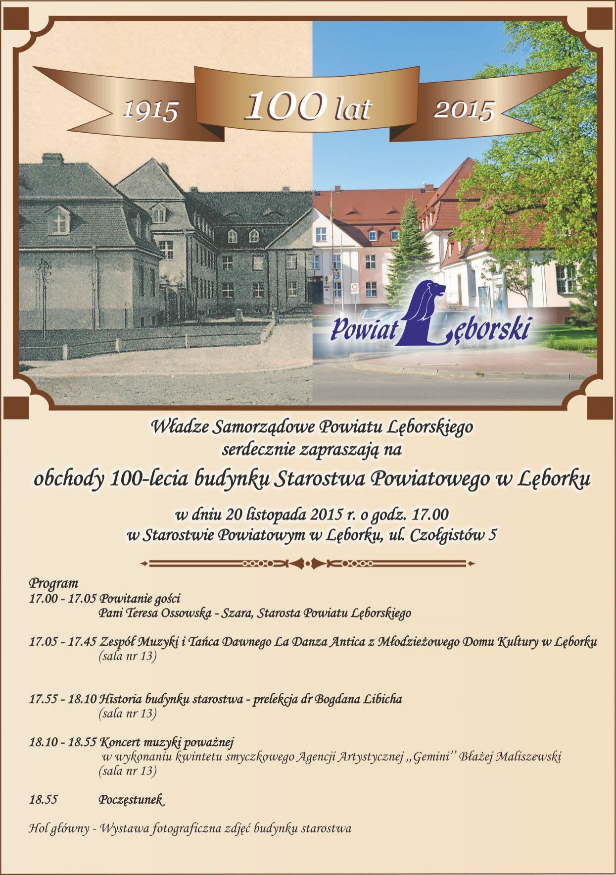 Władze Samorządowe Powiatu Lęborskiego serdecznie zapraszają na obchody 100-lecia budynku Starostwa Powiatowego w Lęborku, w dniu 20 listopada 2015 r. , o godz. 17:00, w Starostwie Powiatowym w Lęborku.