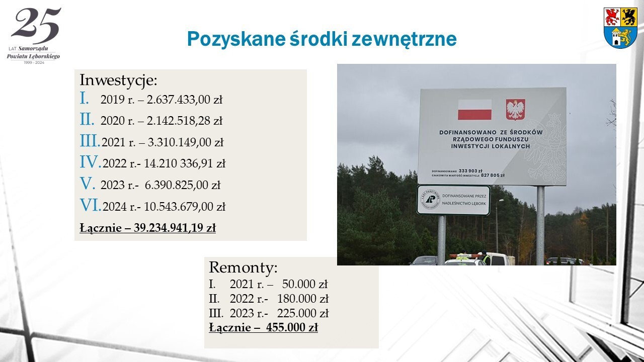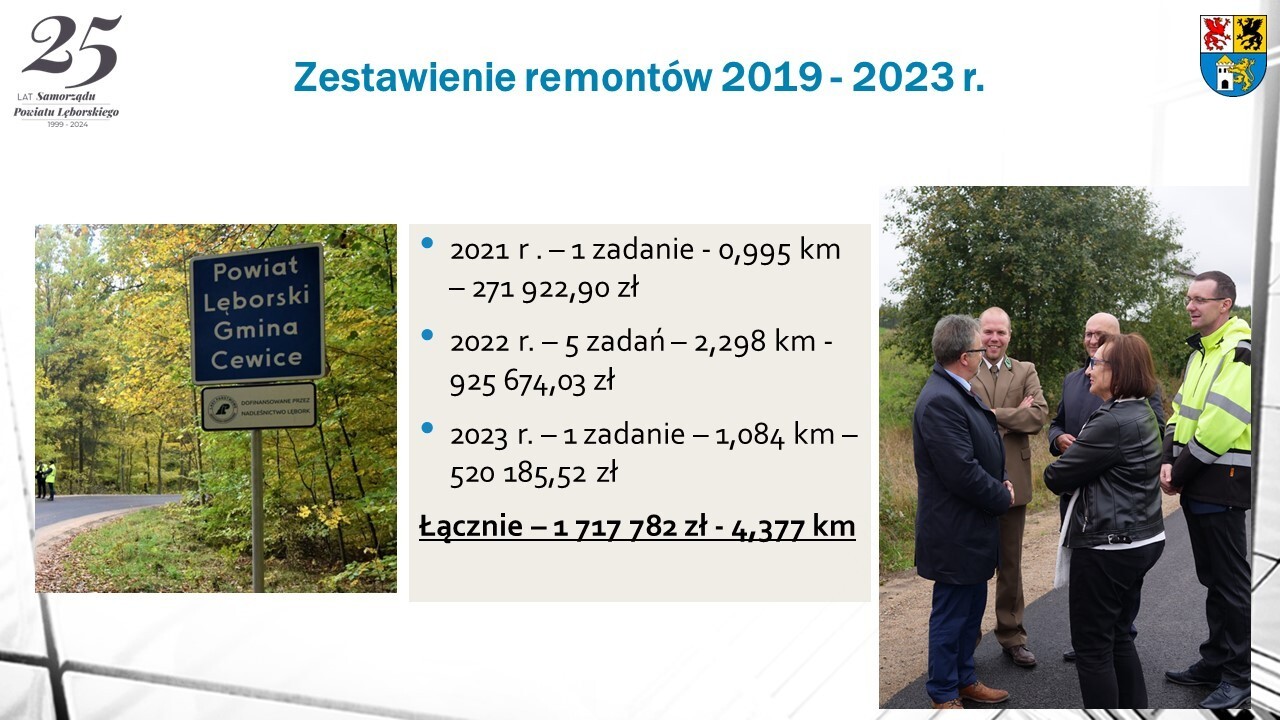 Łącznie na inwestycje drogowe w latach 2019-2023 wykorzystano ponad 46 mln 260 tys. zł. Zostało zrealizowanych 27 inwestycji z dofinansowaniem ze środków zewnętrznych w wymiarze 63 proc. całej wartości przedsięwzięć. Równolegle z działaniami inwestycyjnymi prowadzone były bieżące remonty dróg. Na realizację 7 zadań w latach 2021-23 wydano prawie 2 mln zł., w jednej czwartej wartości z dofinansowaniem ze środków zewnętrznych. Wśród inwestycji najistotniejszych dla poprawy warunków komunikacyjnych na terenie powiatu i bezpieczeństwa użytkowników dróg wymienić należy na pewno: