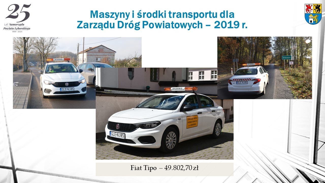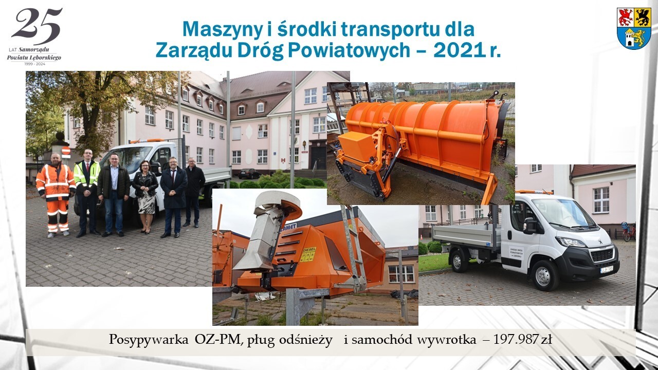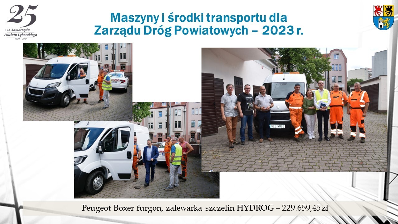 W okresie 2019 – 2023, staraniem Zarządu Powiatu, Zarząd Dróg Powiatowych w Lęborku wzbogacił się o nowe środki transportu: od osobowego Fiata Tipo, służącego głównie do czynności nadzoru i monitorowania, po specjalistyczne pojazdy: Peugeot Boxer furgon, zalewarkę szczelin HYDROG, posypywarkę OZ-PM, pług odśnieżny i samochód wywrotkę.