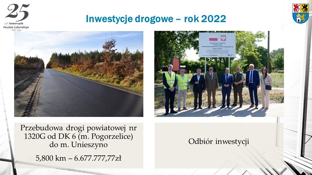 - przebudowę drogi od krajowej DK 6 w Pogorzelicach do Unieszyna,