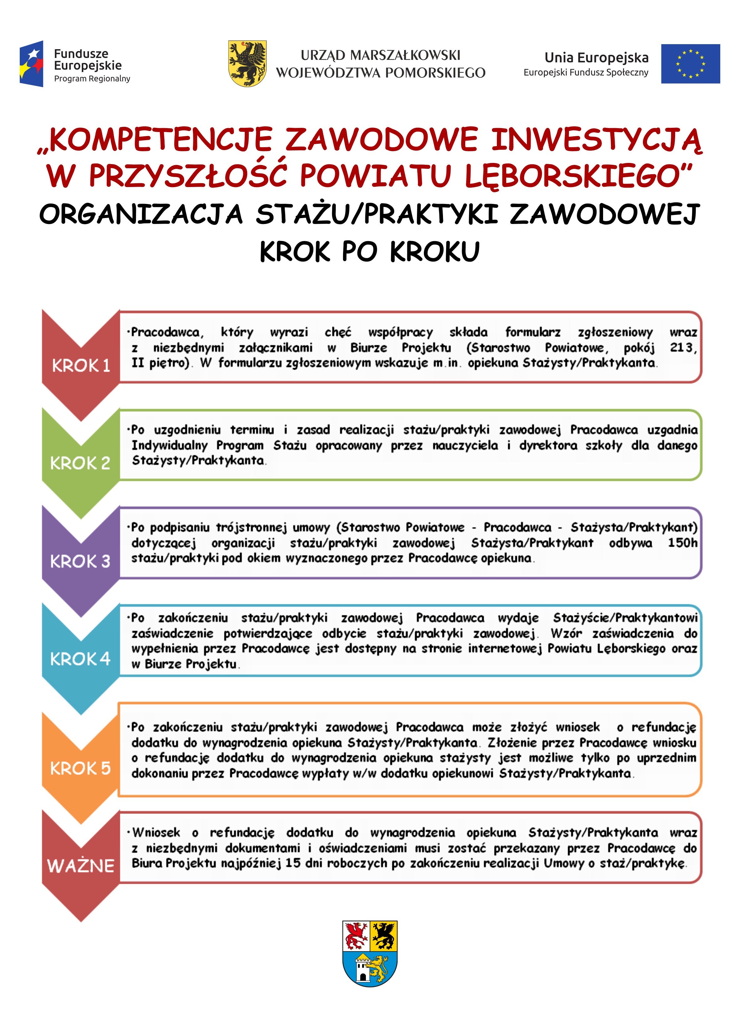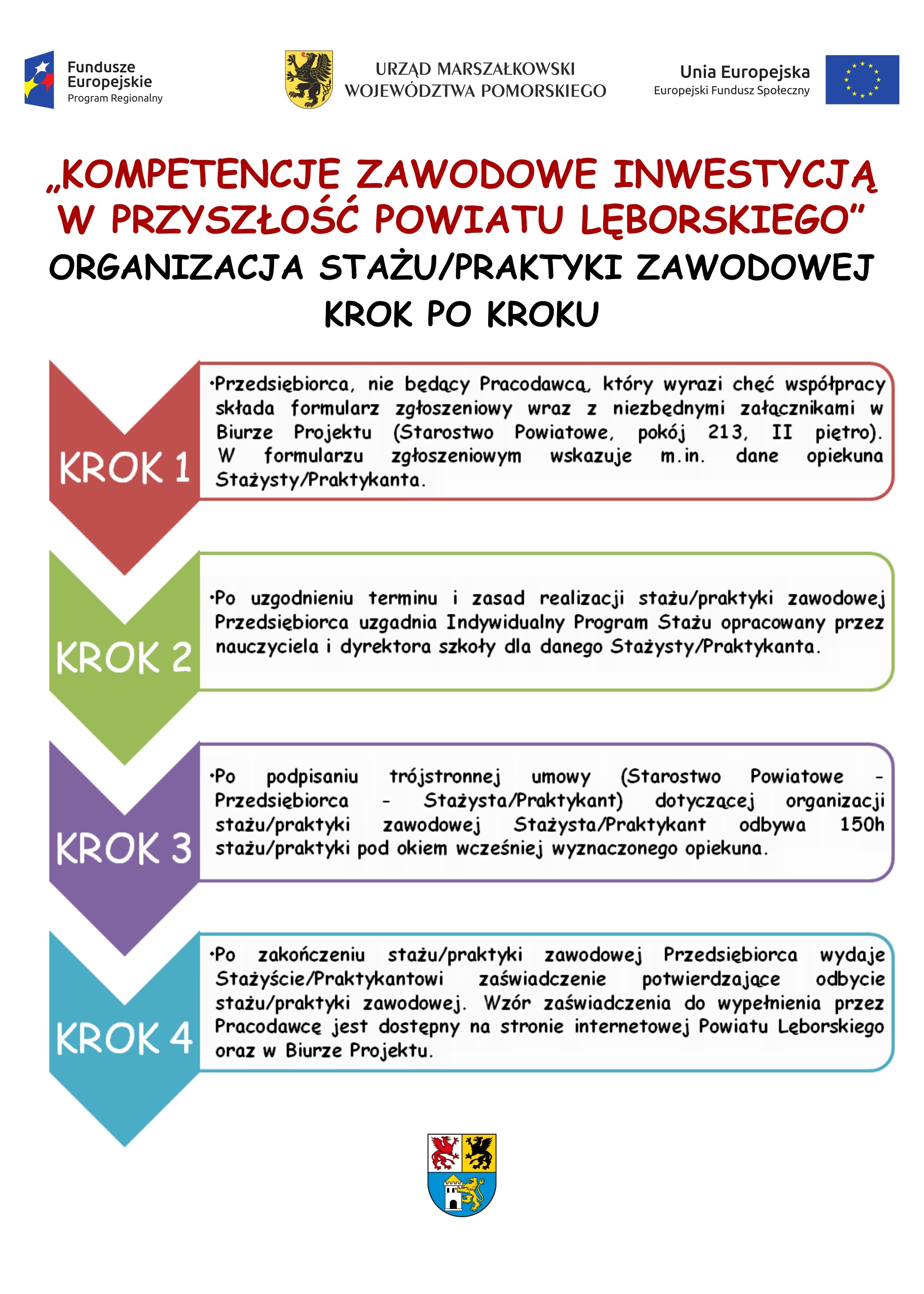 Powiat lęborski od 2017 roku w ramach projektu "Kompetencje zawodowe inwestycja w przyszłość powiatu lęborskiego" współfinansowanego ze środków Europejskiego Funduszu Społecznego w ramach Regionalnego Programu Operacyjnego dla Województwa Pomorskiego na lata 2014-2020 organizuje we współpracy pracodawcami i przedsiębiorcami województwa pomorskiego staże/praktyki zawodowe dla uczniów trzech szkół ponadgimnazjalnych (Powiatowe Centrum Edukacyjne - Zespół Szkół Ponadgimnazjalnych, Zespół Szkół Mechaniczno-Informatycznych, Zespół Szkół Gospodarki Żywnościowej i Agrobiznesu). Staże i praktyki zawodowe pomagają uczniom w nabywaniu kompetencji zawodowych tak ważnych na dzisiejszym rynku pracy.