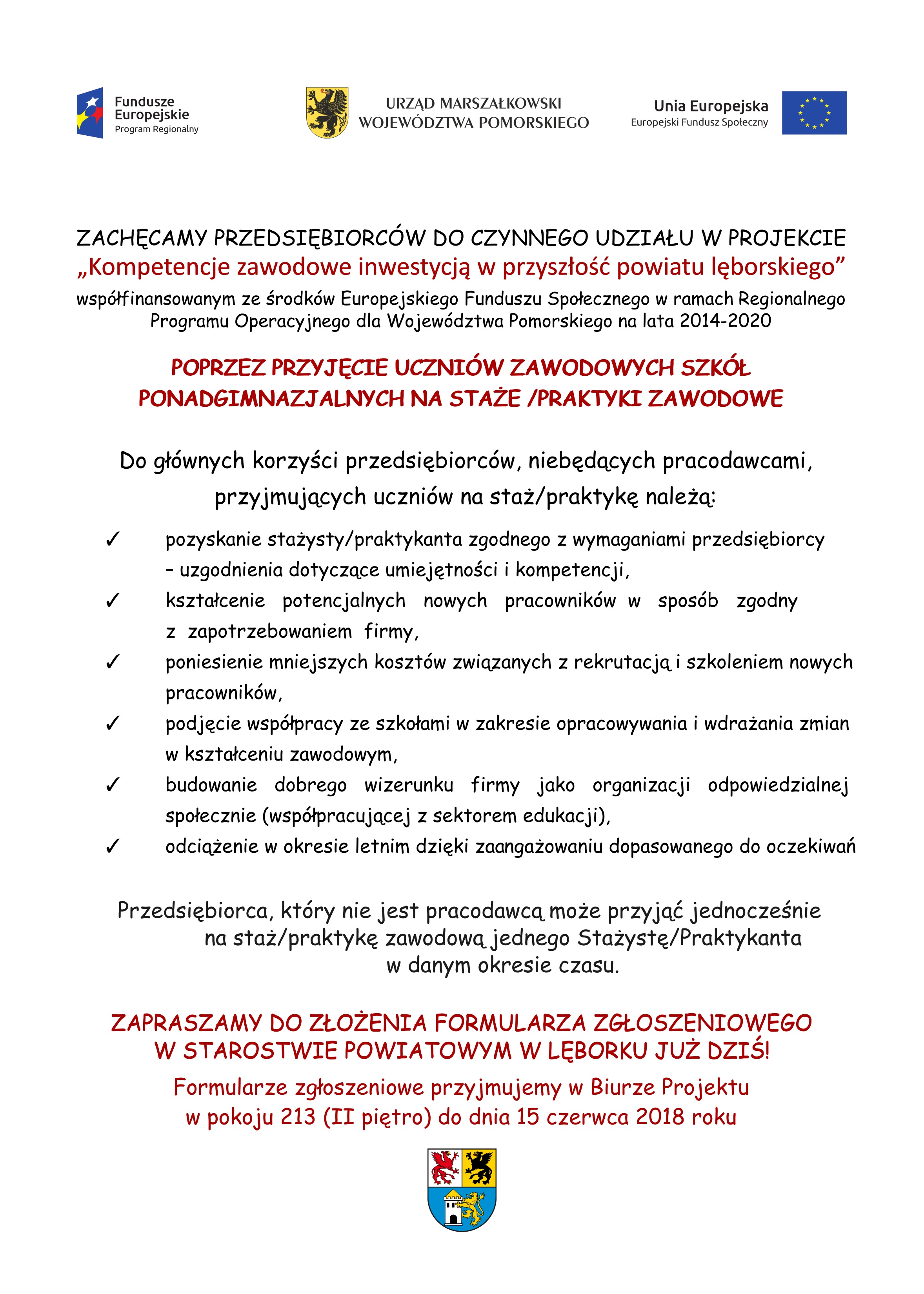 Zachęcamy Pracodawców i Przedsiębiorców do współpracy z Powiatem Lęborskim w zakresie realizacji staży i praktyk/zawodowych dla uczniów zawodowych szkół ponadgimnazjalnych