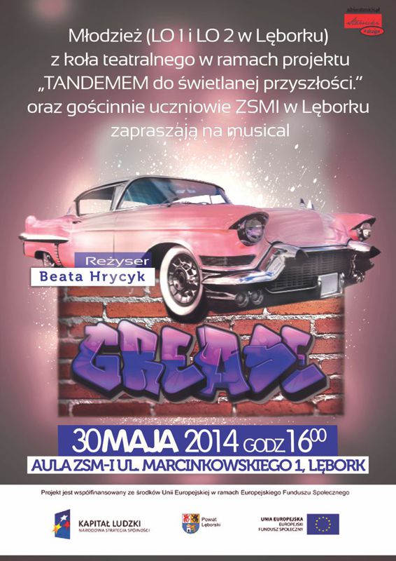 Uczniowie oraz opiekun kółka teatralnego realizowanego w ramach projektu „Tandemem do świetlanej przyszłości” mają zaszczyt zaprosić Państwa 30.05.2014r. o godz. 16.00, na musical zrealizowany na podstawie filmu "Grease”.