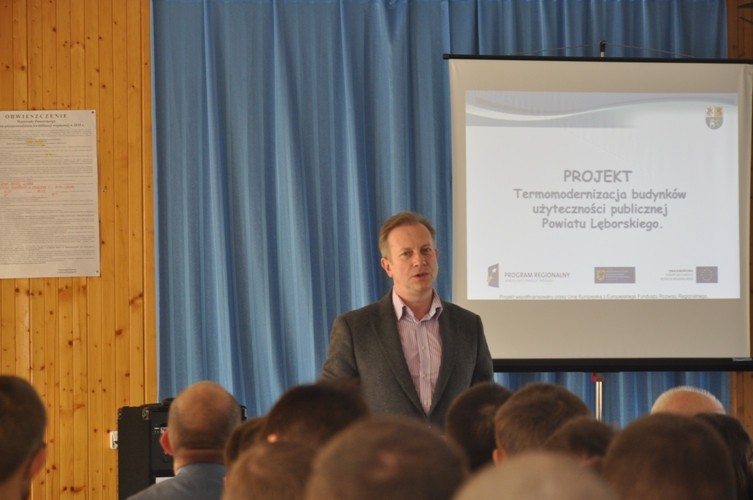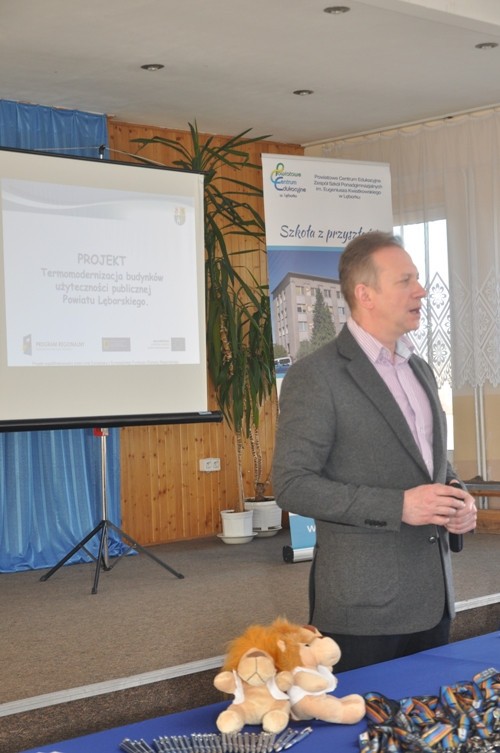Przybyłych gości powitał Pan Wicestarosta Maciej Barański. Prezentację na temat zrealizowanych przedsięwzięć przedstawił Pan Andrzej Kubiak - kierownik Referatu Rozwoju i Promocji Starostwa Powiatowego w Lęborku. Realizację projektu Powiat rozpoczął z dniem 31.10.2011 roku, a zakończył 30.09.2014 r. Łączna wartość projektu to 4.994.520,24 PLN, z czego wartość dofinansowania z Unii Europejskiej wyniosła 3.726.589,52 PLN natomiast budżet Powiatu Lęborskiego 1.242.196,52 PLN. Projekt obejmował termomodernizację 5 obiektów użyteczności publicznej, w tym: Młodzieżowy Dom Kultury w Lęborku, Specjalny Ośrodek Szkolno-Wychowawczy (szkoła i internat), Powiatowe Centrum Edukacyjne - Zespół Szkół Ponadgimnazjalnych w Lęborku oraz Zespół Szkół Gospodarki Żywnościowej i Agrobiznesu w Lęborku. Serdecznie dziękujemy wszystkim przybyłym za udział w konferencji. Szczególne podziękowania kierujemy również do osób zaangażowanych w realizację w/w projektu.