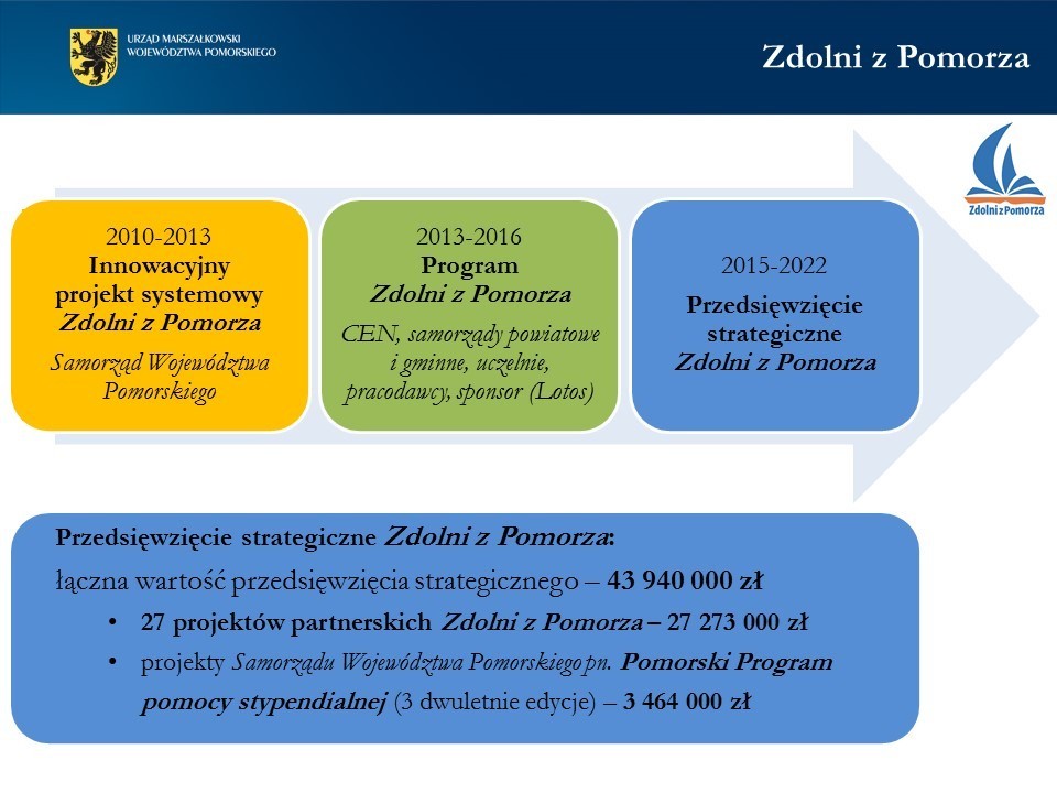 Celem projektu jest zapewnienie wszystkim uczniom szczególnie uzdolnionym z terenu województwa pomorskiego odpowiedniego wsparcia rozwoju poprzez właściwą diagnozę uzdolnień i adekwatne formy pomocy.