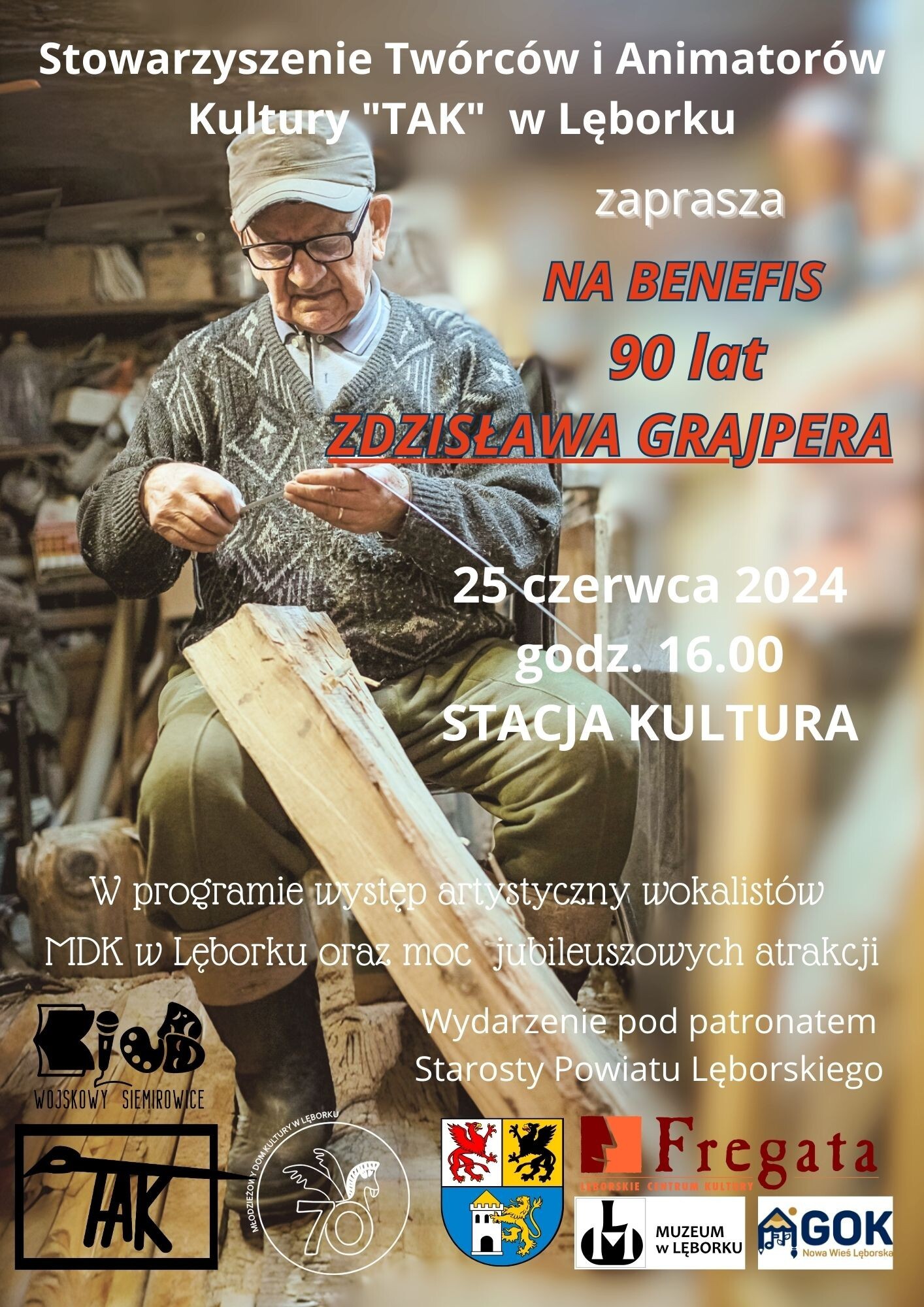 Stowarzyszenie Twórców i Animatorów Kultury "TAK" w Lęborku zaprasza na jubileuszowy benefis w 90 rocznicę urodzin artysty i nauczyciela, związanego od 70 lat z Lęborkiem - Zdzisława Grajpera.