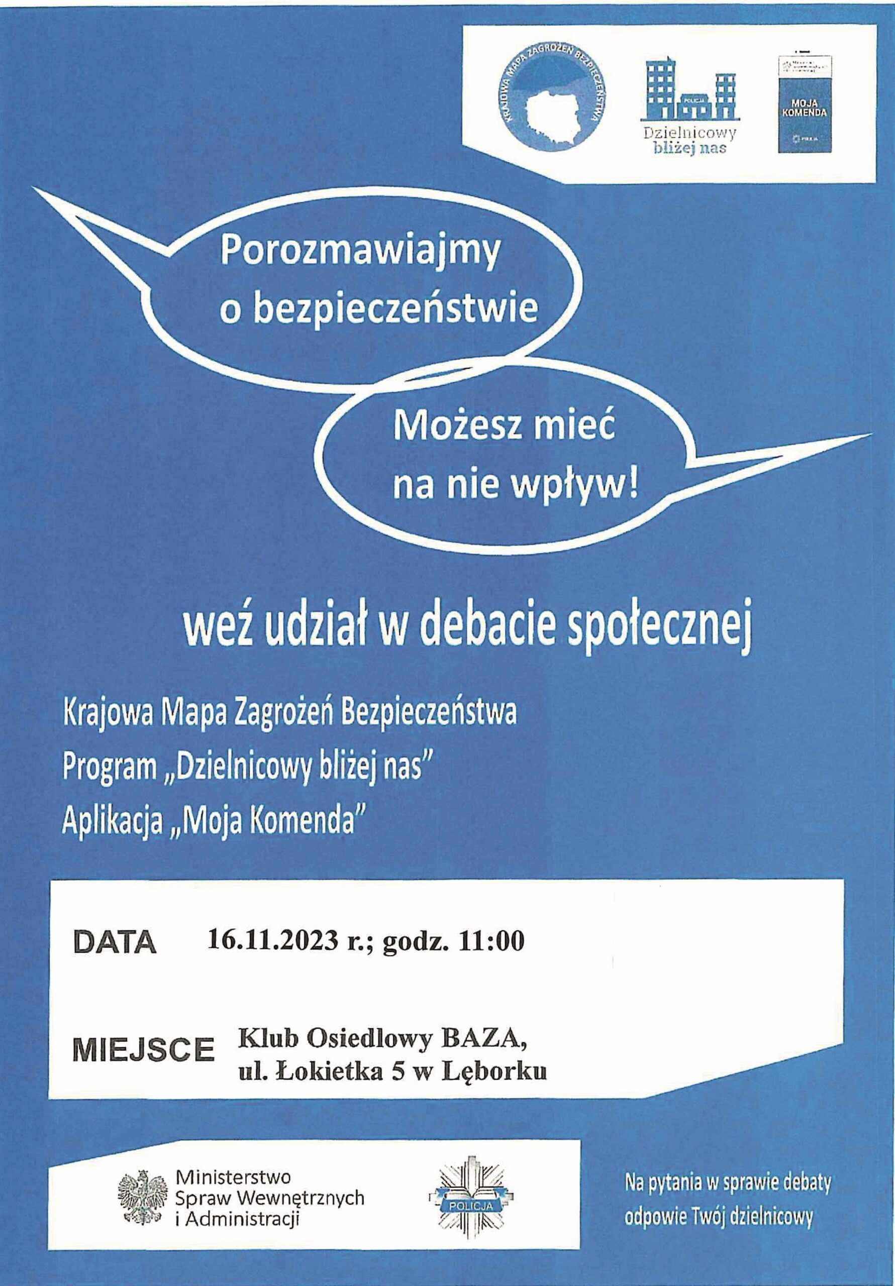 Komenda Powiatowa Policji w Lęborku zaprasza na debatę społeczną w ramach spotkań o wspólnej nazwie POROZMAWIAJMY O BEZPIECZEŃSTWIE - MOŻESZ MIEĆ NA NIE WPŁYW!, w obszarze bezpieczeństwa seniorów skierowaną do mieszkańców miasta i powiatu lęborskiego, która odbędzie się w dniu 16 listopada br. w godz. 11.00-12.00 w Klubie Osiedlowym BAZA przy ul. Łokietka 5 w Lęborku.