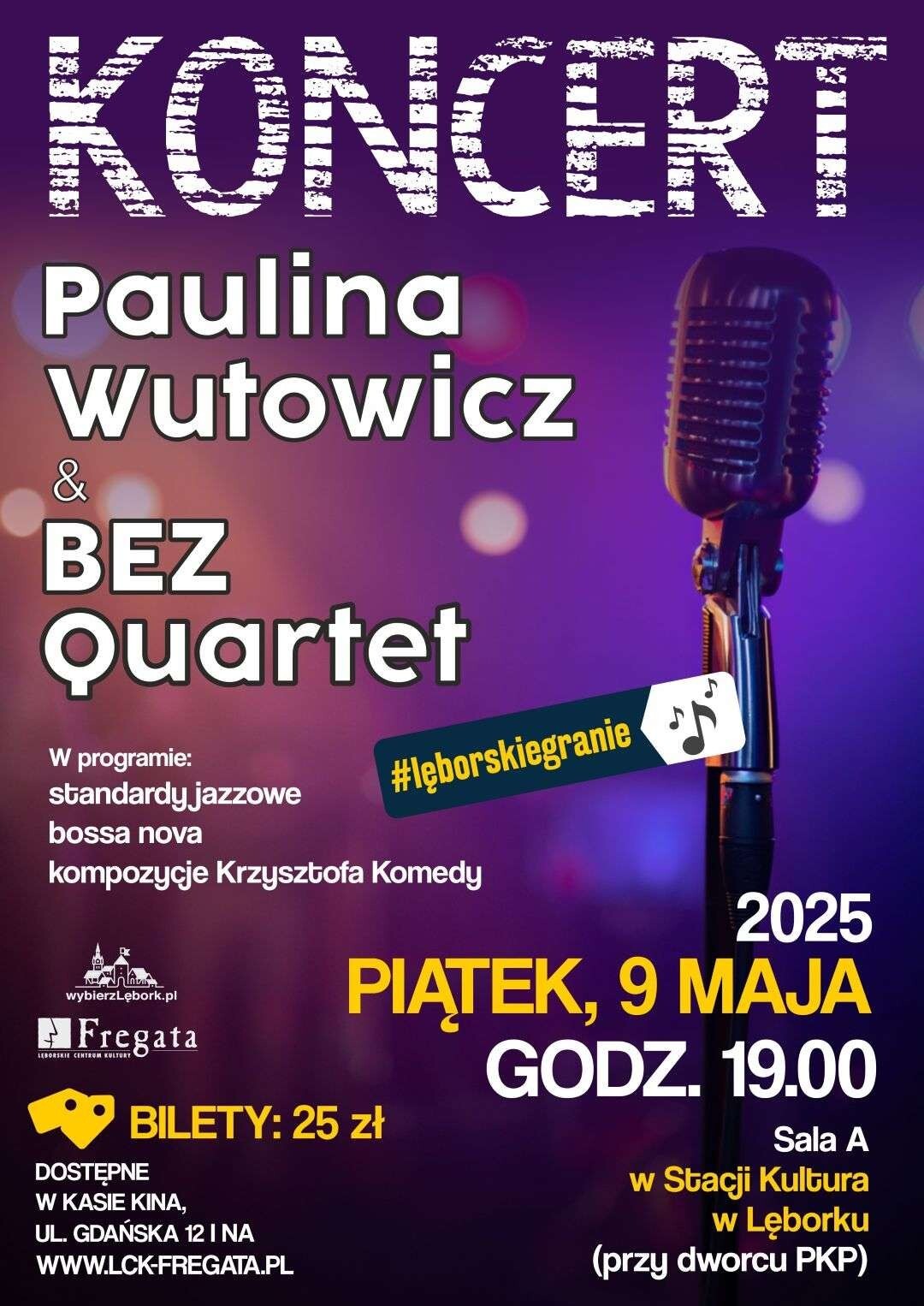 Lęborskie Centrum Kultury „Fregata” zaprasza na koncert Pauliny Wutowicz z grupą BEZ Quartet. Projekt powstał z inicjatywy Lęborczan: wokalistki Pauliny Wutowicz i perkusisty Janka Wróblewskiego i jest efektem ich kilkuletniej przyjaźni i współpracy. Towarzyszyć im będą: Michał Staśkowiak (bas), Aleks Hejber (piano) i Wiktor Szerszeń (trąbka, flugelhorn) - wszyscy związani z Akademią Muzyczną w Bydgoszczy.