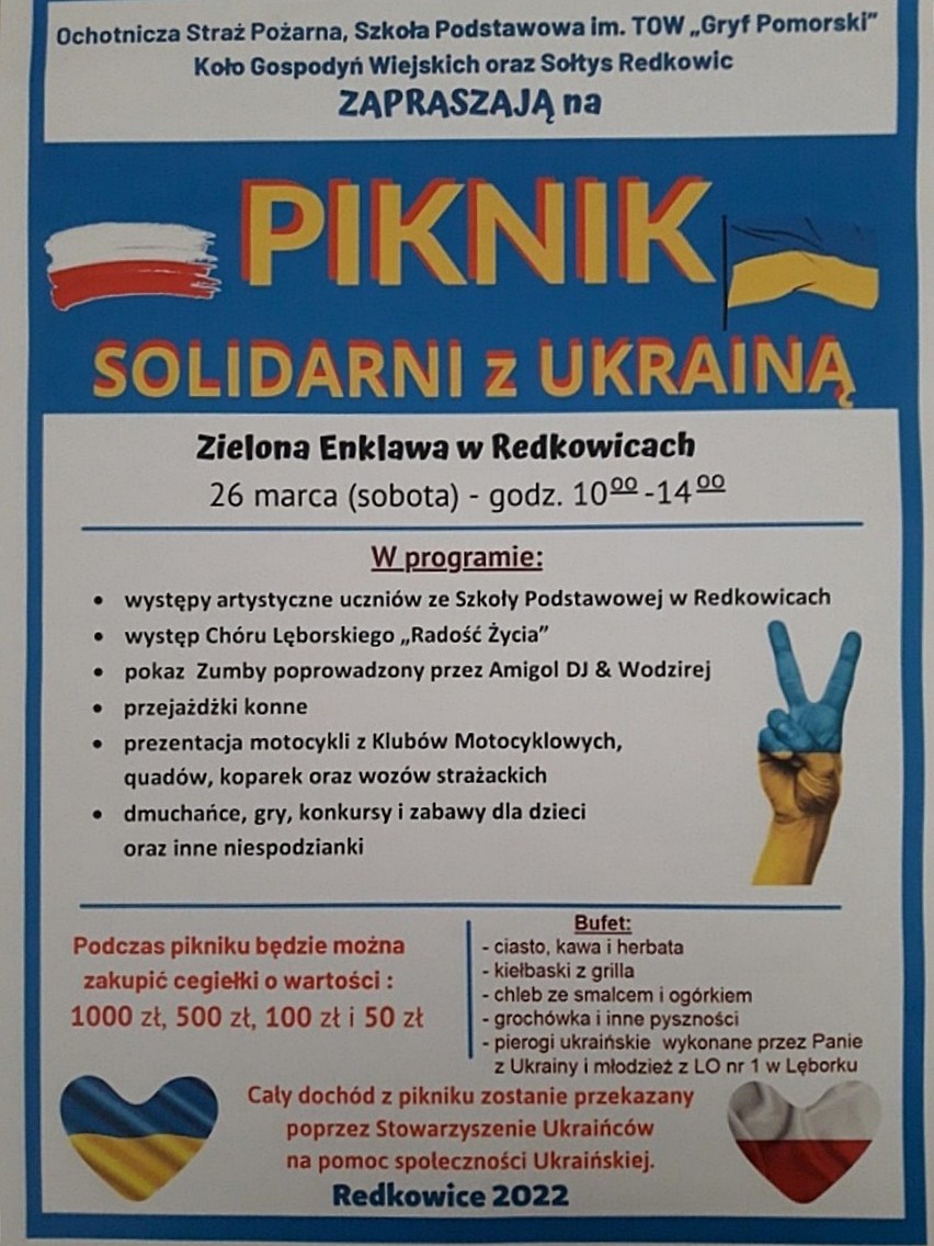 Występy artystyczne uczniów SP w Redkowicach, występ Chóru Lęborskiego „Radość Życia”, pokaz Zumby prowadzony przez Amigol DJ & Wodzirej, przejażdżki konne, prezentacja motocykli z Klubów Motocyklowych, quadów, koparek oraz wozów strażackich, dmuchańce, gry, konkursy i zabawy dla dzieci, sprzedaż cegiełek na pomoc dla Ukrainy