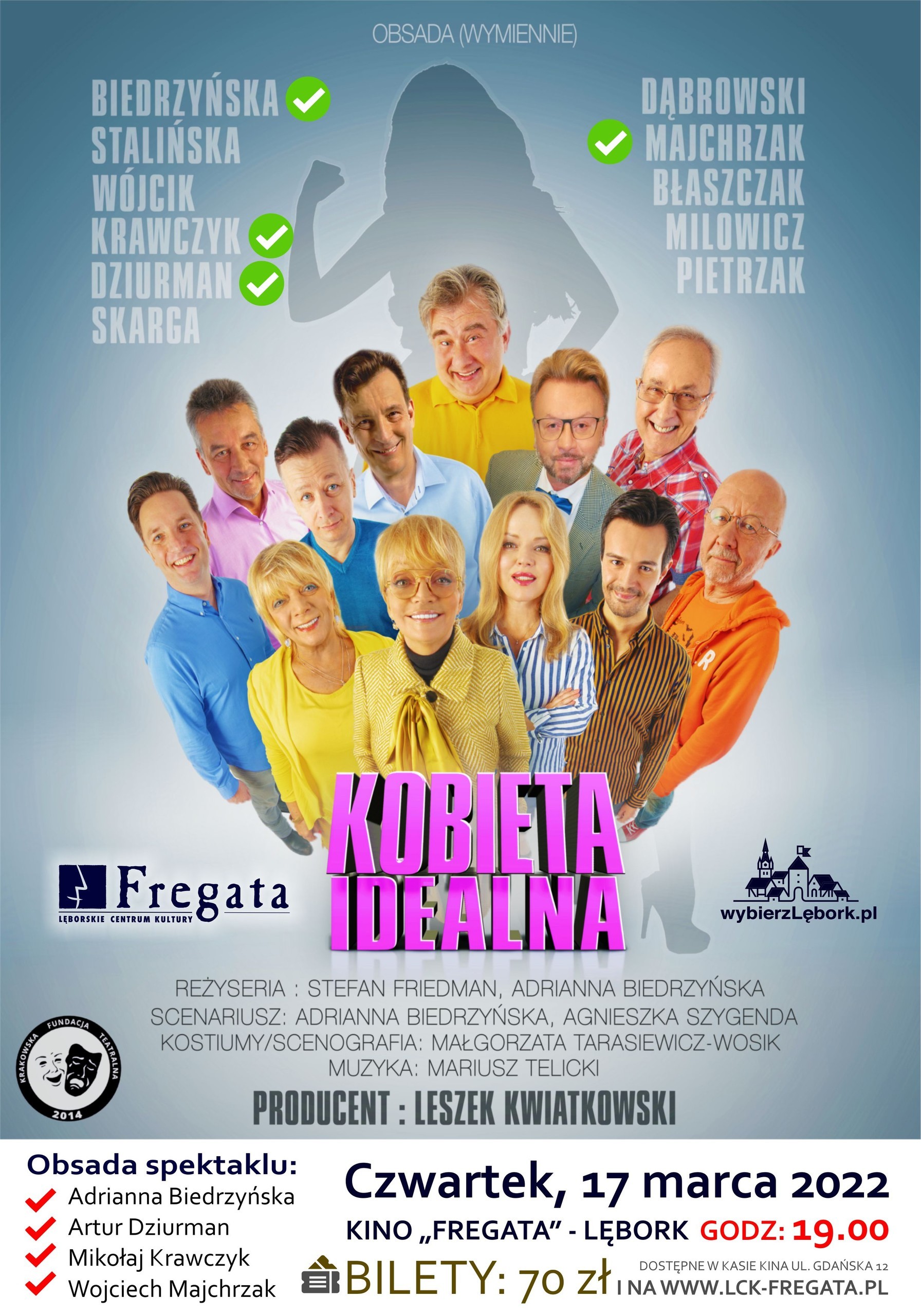 Lęborskie Centrum Kultury „Fregata” zaprasza na „Kobietę idealną” - spektakl komediowy w reżyserii Stefana Friedmanna i Adrianny Biedrzyńskiej. W czwartek, 17 marca 2022 roku o godzinie 19:00, na scenie we „Fregacie”, publiczność obejrzy komedię z udziałem znanych aktorów teatralnych i filmowych. Bilety w cenie 70 złotych dostępne są w kasie kina przy ulicy Gdańskiej 12 oraz za pośrednictwem strony www.lck-fregata.pl .