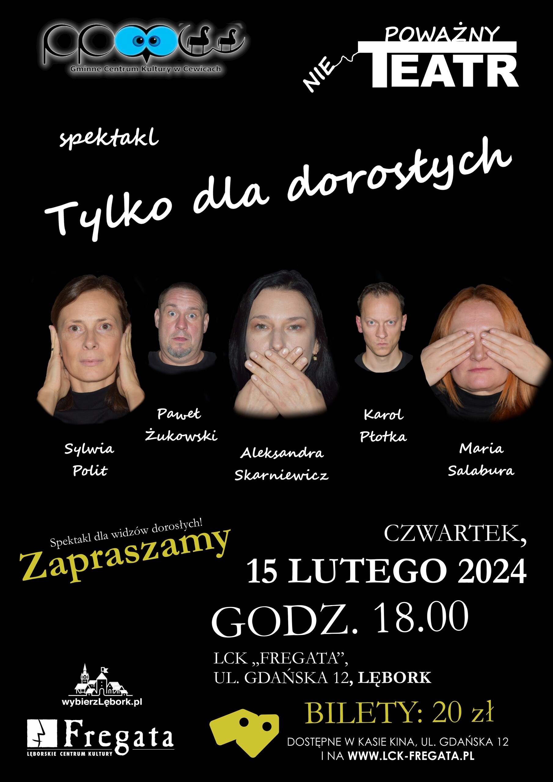 Gminne Centrum Kultury w Cewicach i Lęborskie Centrum Kultury „Fregata” zapraszają na spektakl teatralny pod tytułem „Tylko dla dorosłych”. Sztuka przygotowana przez aktorów działających przy GCK w Cewicach zostanie wystawiona w lęborskiej „Fregacie” w czwartek, 15 lutego 2024 roku. Początek o godzinie 18:00. Bilety w cenie 20 złotych dostępne są w kasie kina oraz na stronie www.lck-fregata.pl
