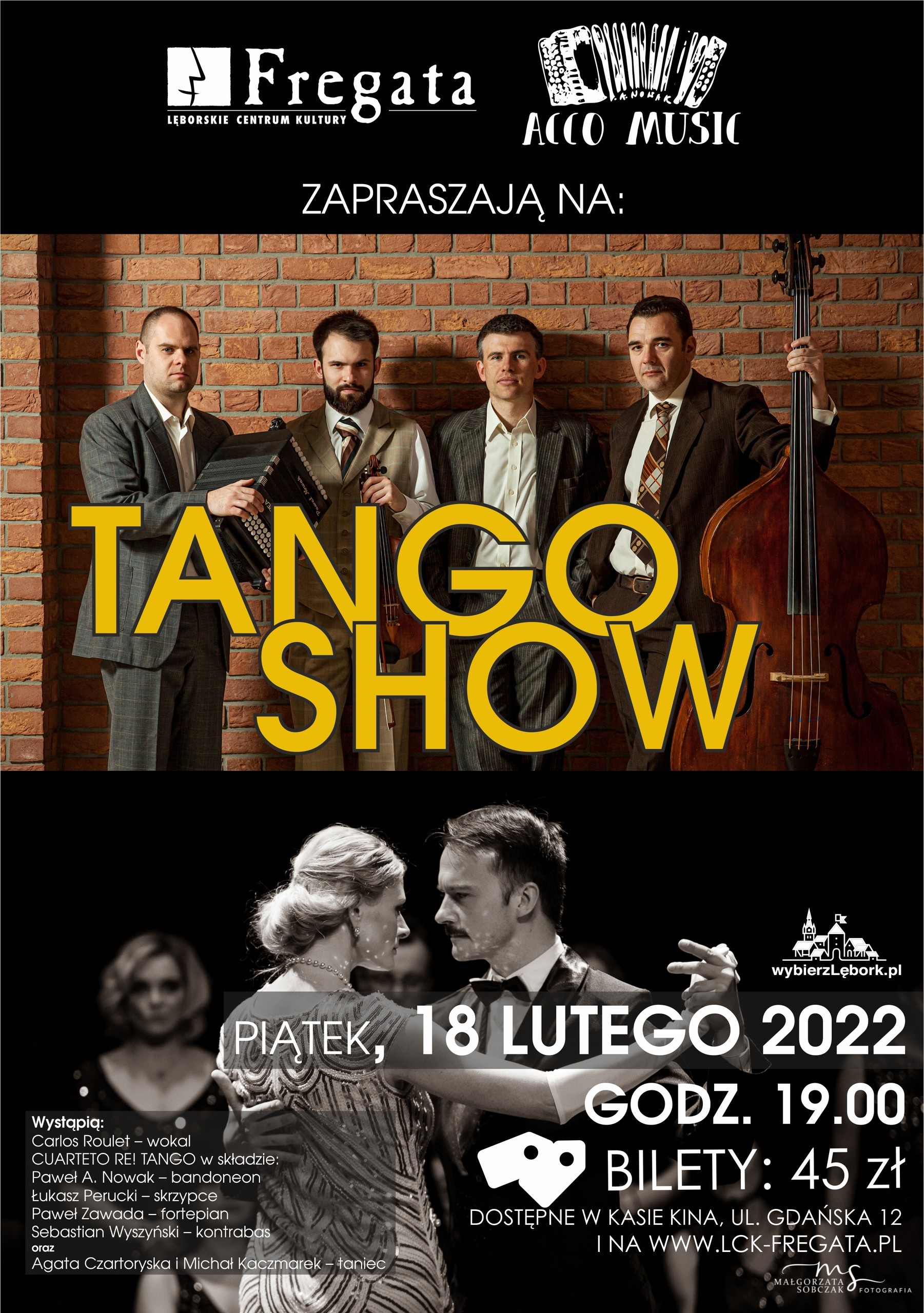 Lęborskie Centrum Kultury "Fregata" zaprasza na wyjątkowe taneczno-muzyczne show z gwiazdami tanga argentyńskiego. W piątek, 18 lutego 2022 roku, na scenie lęborskiego Kina, wystąpi zespół CUARTETO RE! TANGO, który składa się z pasjonatów tej pochodzącej z Argentyny muzyki. Towarzyszyć im będzie Carlos Roulet - pochodzący z Buenos Aires śpiewak tanga oraz profesjonalna para taneczna - Agata Czartoryska i Michał Kaczmarek, dzięki którym przeniosą się Państwo na ulice najbardziej roztańczonego miasta na świecie.