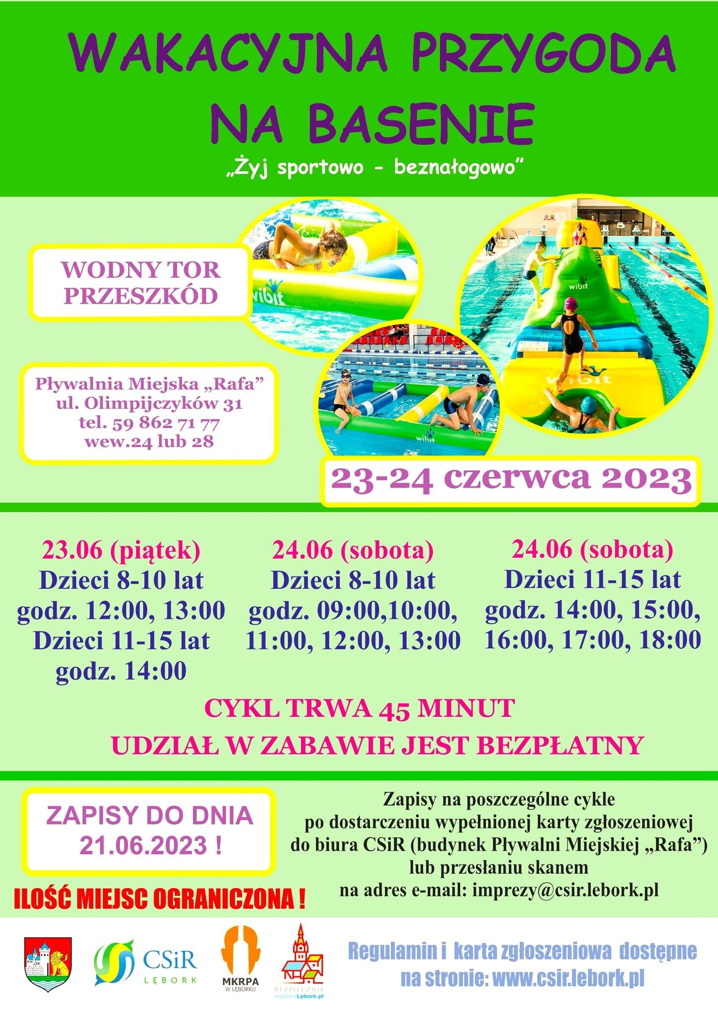 Burmistrz Miasta Lęborka, Centrum Sportu i Rekreacji oraz drużyna WOPR przy CSiR serdecznie zapraszają dzieci i młodzież do wspólnej zabawy na basenie. Zabawy na Wodnym Torze Przeszkód odbędą się 23 i 24 czerwca 2023 r. na Pływalni Miejskiej "Rafa" przy ul. Olimpijczyków 31 w Lęborku. Udział z zabawach dzieci jest nieodpłatny.