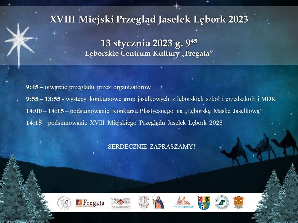 Lęborskie Centrum Kultury "Fregata" zapraszana XVIII Miejski Przegląd Jasełek, który odbędzie się 13 stycznia 2023 w Sali Kina "Fregata". Początek wydarzenia o godzinie 9:45. Do udziału zaproszone zostały lęborskie placówki oświaty i kultury. Przegląd odbędzie się w kategoriach: